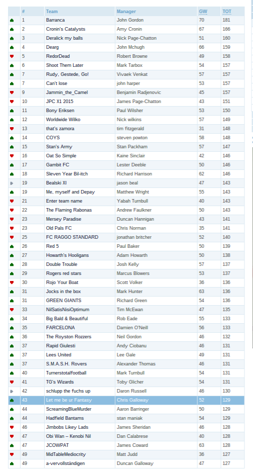 Welcome to a new regular feature, each Tuesday (or after each gameweek) we will post an image of the first page of the FFUK mini league leaderboard.