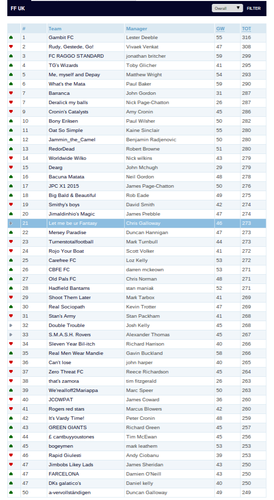 In the FFUK league Lester Deeble (1st) remains at the pinacle with a solid 55 point score. Close behind is Vivaek Venkat (2nd). Jonathan Britcher (3rd) scored an impressive 59 points as did Paul Baker (6th). Matthew Wright (4th) and Toby Glicher (5th) complete the top 5. Nick Page Chatton (8th) had a week to forget only scoring 26 points, he must be cursing Silva’s injury as Benteke was VC and also went off injured at half time! In general it was solid scoring for most of page 1 of the league, in fact there is only 60 odd points between the top of the league and Duncan Galloway (50th). Somehow Pete Cronin (42nd) is yet to capitulate, he must be getting tips from his sister, Amy Cronin (9th). Looking further down the league there are only 50 points between Lawrie Smith (51st) and Grant Lawrie (100th) so one good captain choice can get you climbing that leaderboard and forgetting all of your fantasy troubles.