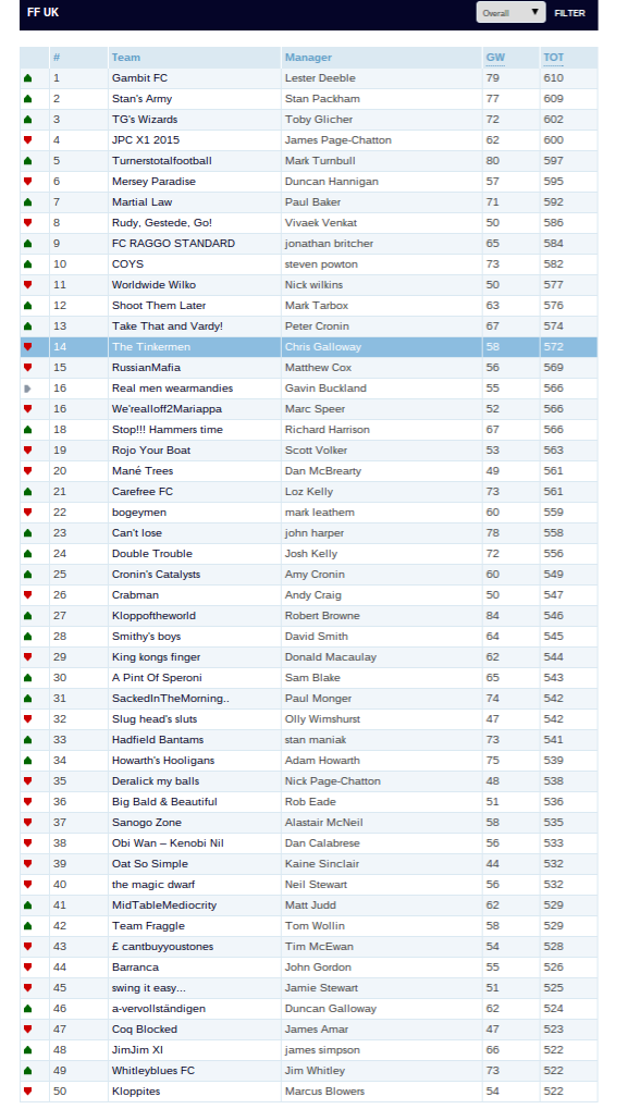 Toby Glicher (3rd), James Page-Chatton (4th) & Mark Turnbull (5th) all continued with decent performances from their teams. Mark in particular has been very strong in recent weeks & was 2nd overall for October. You dont want to face any of the form managers in the cup if possible!