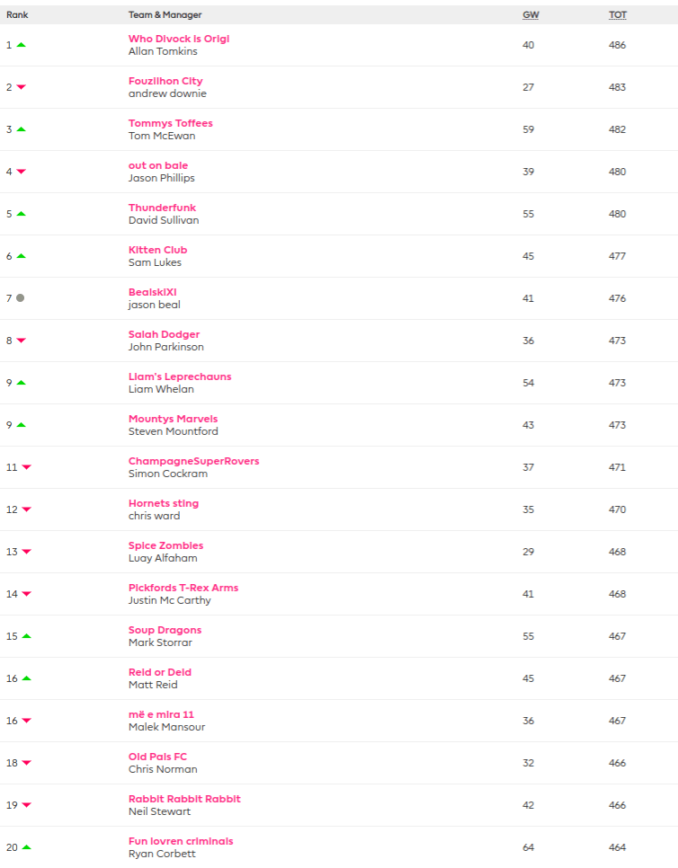 Biggest mover in the top 10 was Tom McEwan (3rd) with 59 scored this week. Tom was one of the lucky ones who got some points from his captain as he selected Mane (12 x 2).