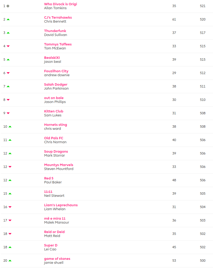 At the other end of the scale we find Andrew Downie (6th) who low scored with 29 with his fresh wildcard side, how often does a wildcard lead to a disappointing score? It’s like the FPL gods are against us. Some of us especially. Andy was one of 23 FFUKers to captain the prolific Argentinean but we were all left scrambling to remember who we had vice as Pep didn’t feel the need to introduce Kun. Or Otamendi. Or Mahrez.