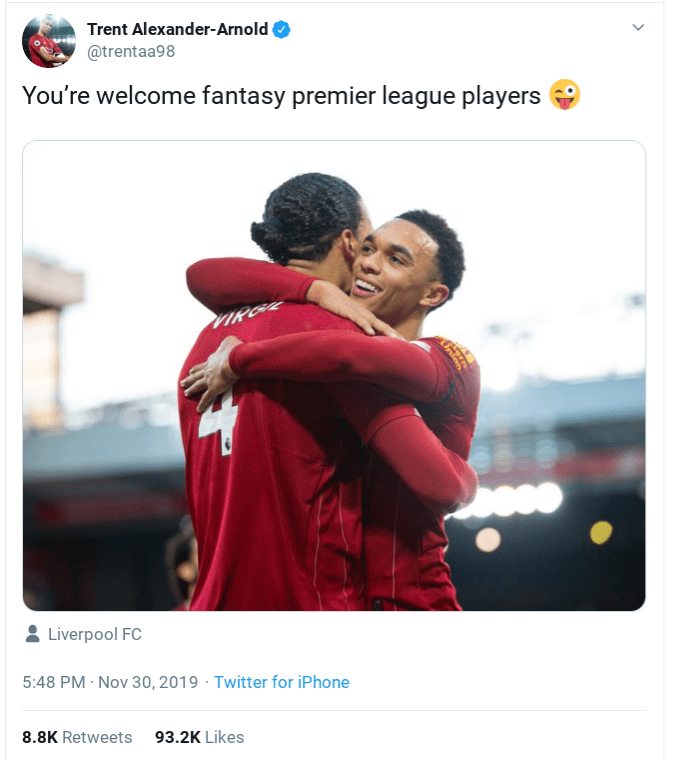Needless to say big VVD (17) was the player to own this week. If you had TAA (10) as well you were in high scoring triple barrel Liverpool defender acronym dream land. Rolls off the tongue. One such person was this weeks top scorer Glen Johnson (209th) with a whopping 89 points. Fine full back in his day too. For most of us it was an either / or however and one of the stranger goals you’ll see from Lewis Dunk (thanks very much Mr. Atkinson) meant the mega points for a clean sheet as well were wiped out. It was a good week for goalscoring defenders with Creswell (14) and Doherty (10) getting in on the act.