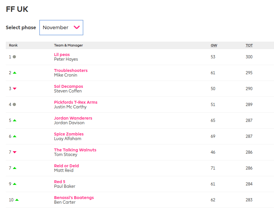 We have a new joint leader in Paul Baker (1st) who jumped from fourth last week with an impressive score of 61 despite leaving Cantwell (8) and Dunk (8) on the bench. Pretty impressive from Mr. Cups. I’m level with him after a bang average GW of 51, the average score in the overall game.