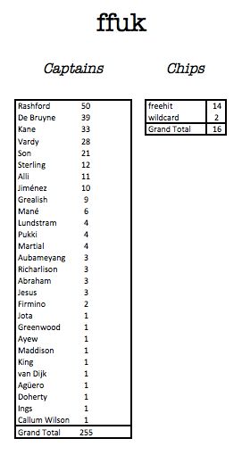 Next best was Chris Ward (16th) and James Sheridan (179th) who both managed 68 points demonstrating the depth in the FFUK league. Chris was one of just 4 in the league who gave the armband to Pukki (4) whilst James was one of 39 who gave KDB (8) the nod.