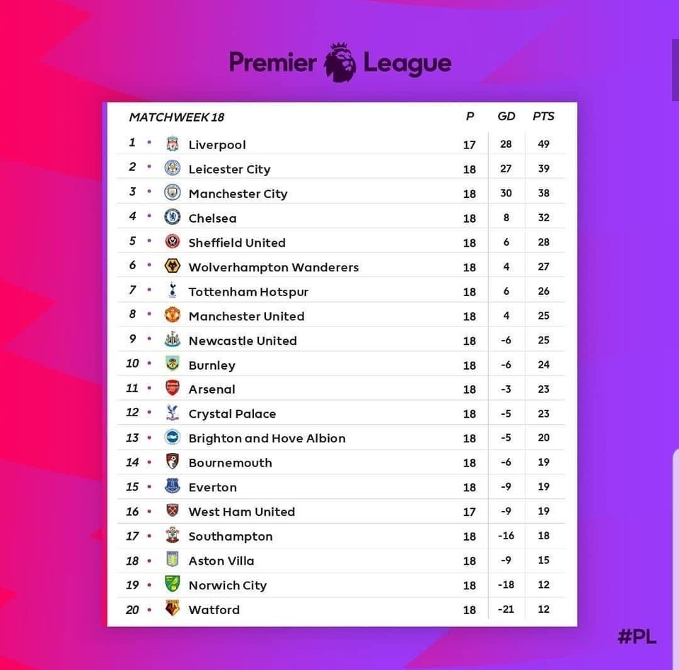 Perhaps lets start with the PL table at Xmas. Liverpool have already won the Premier League unfortunately. Thankfully the FFUK league is far more competitive. The 3 remaining CL places are more up in the air with Man City, Leicester and Chelsea currently holding those positions. But the success story of the season so far has to be Sheffield United, the Blades under Chris Wilder and led by Lord Lundstram are above Man Utd, Tottenham and Arsenal, and no one would or could have predicted that pre-season. I have grown to admire Chris Wilder this season with every game I see of theirs and every time I see him talk. His team plays a fascinating brand of football and he seems a very sensible and like-able chap to me, he even gave all the journos at the last presser before Xmas a present!