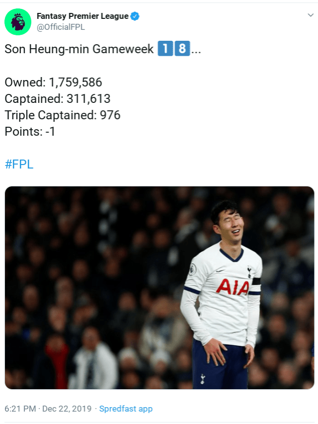 Speaking of Son there were 21 FFUKers who were properly disgusted as their captain received his 2nd red card of the season after kicking out at Rudiger. 3 game ban in place. Plenty of us are now looking at who to replace him with….