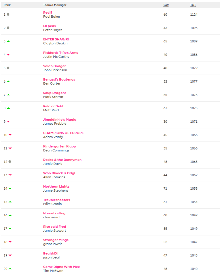 At the top there is no change so Paul Baker (1st) is top of the tree at Xmas after a solid GW18 scoring 60 points. November MOTM Peter Hayes (2nd) is behind him but Bakes has just opened up a little gap. So Mr Cups is dominating the league, ominous for the rest of us!