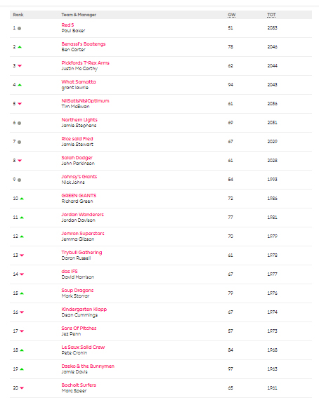 Not everyone got burned though. Ben Carter is up to second, Grant Lawrie closing down in fourth, and top scorer of the GW, Jamie Davis is up to 19th with a delicious 97 points – winning him £15 in the process.