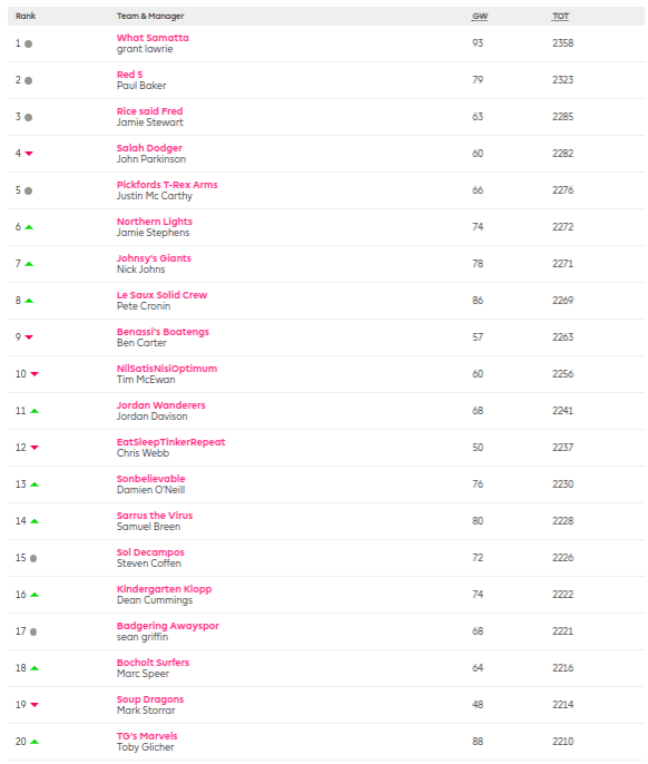 Trevor Dennison (89th – 90 points) rose 26 places in the league this gw off the back of an excellent gw score, and likewise, Rob Latuske (152nd – 90 pts), has a great week.