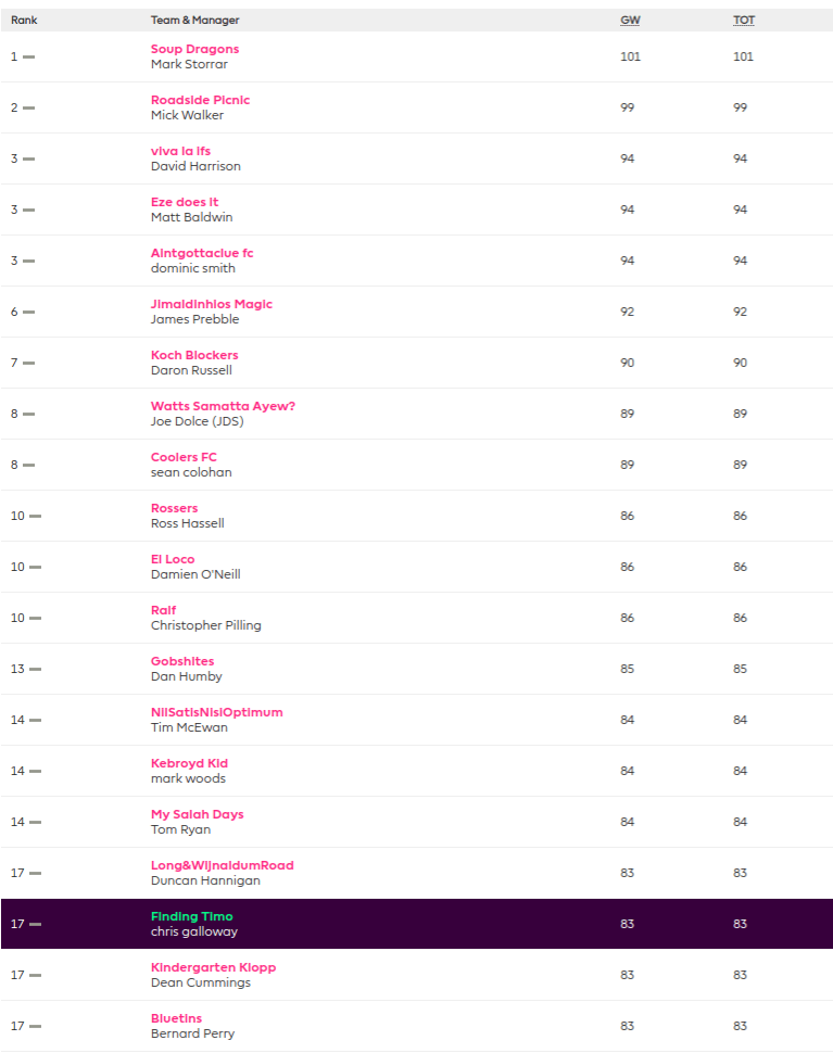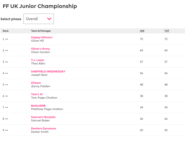 Next up we look at the top of the FFUK table as this is what matters in terms of prizes come the end of the season. And for the first time in a very very long time I am actually in it. FFUK knows how long that may last.