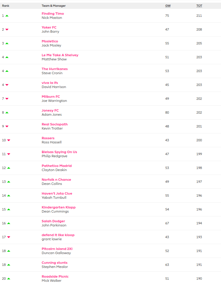 This weeks Leader on an impressive 211 points (the magic 70 points per week average) is Nick Maston who picked up 75 points this game week. Fernandes captain (24) and Vardy 17 setting him up nicely. Well done Nick! He also wins the very first MOTM for September and is the first recipient of a prize so far this season!
