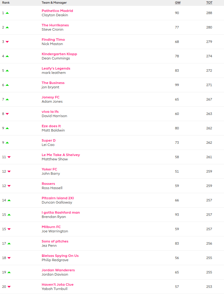 We have a new leader in Clayton Deakin (90) who takes top spot despite having Son (18) on the bench. Steve Cronin (77) is right on his heels with last weeks leader and September’s manager of the month Nick Maston (68) slipping to a close third. There were a couple of notable wildcards with Dean Cummings (78) moving from 14th to 4th but for Matthew Shaw (58) it had the opposite effect moving from 5th to 11th. Special shout out to John Bryant (99) whose gw topping score moves him from 65th to 6th.
