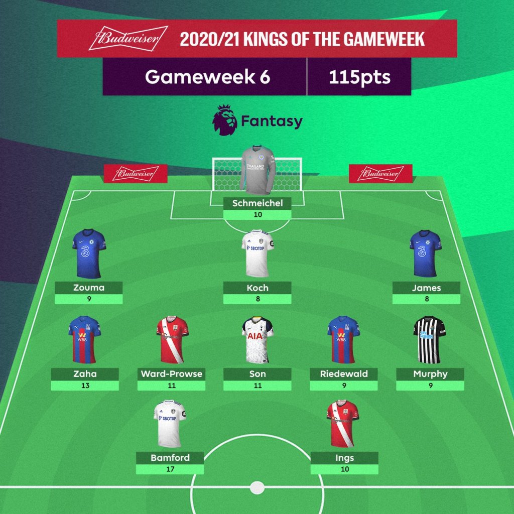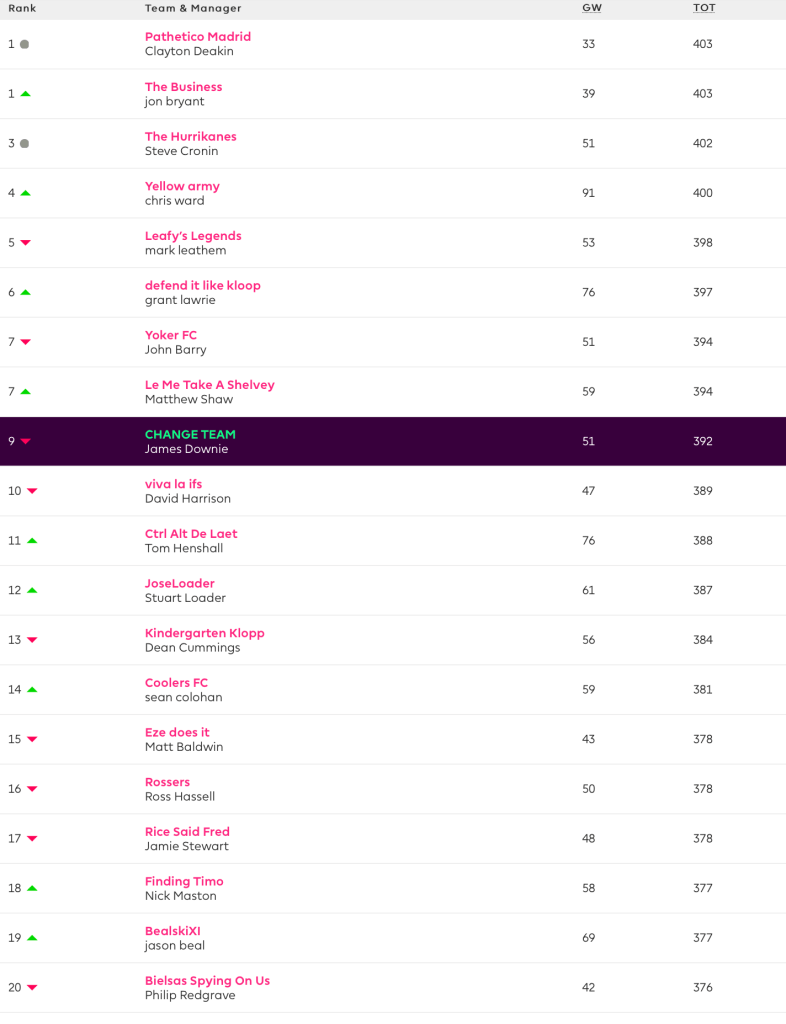 The top scorer in the top 20 was Chris Ward’s– Yellow Army with a fantastic 91 points. He had Bamford C, Son and Zaha