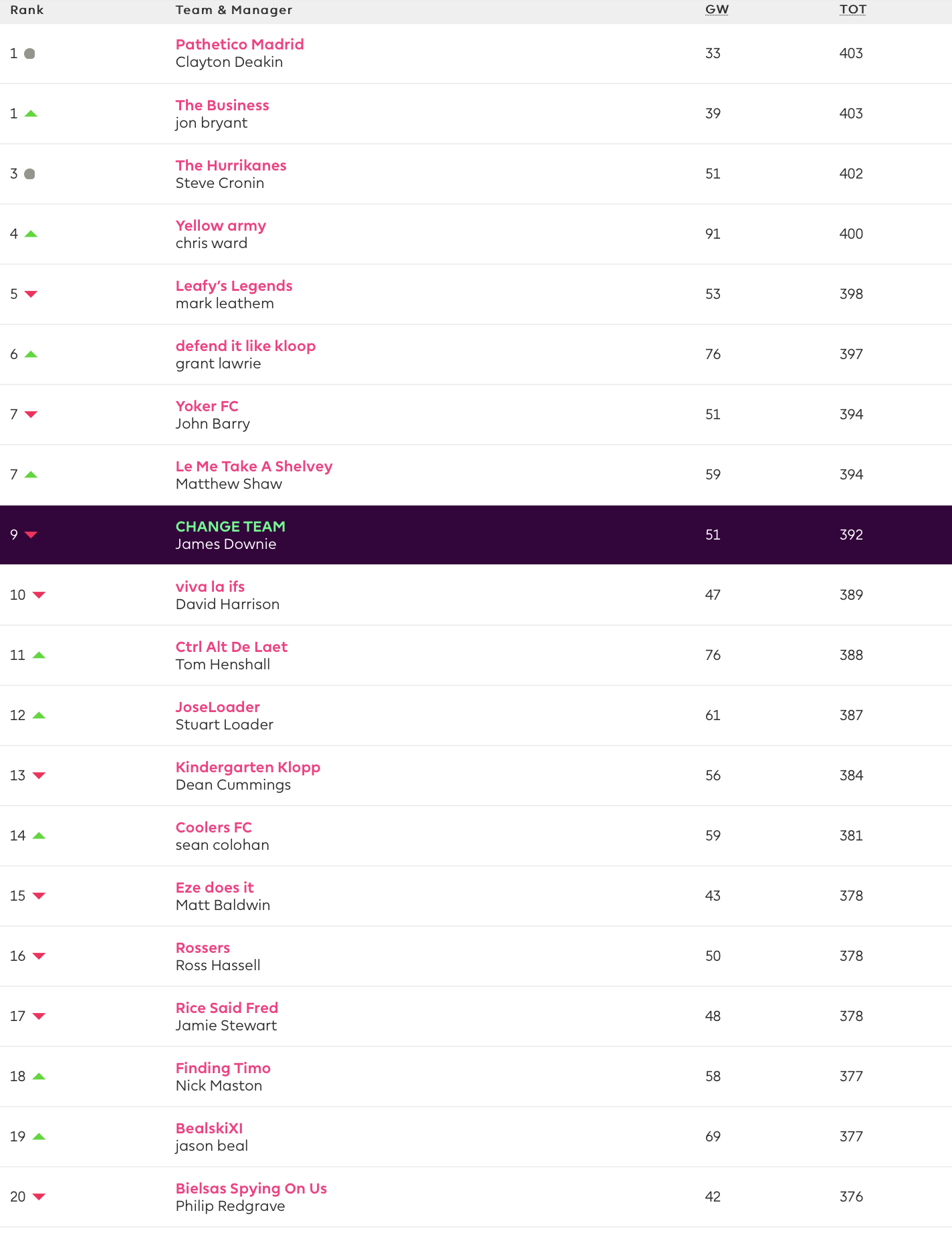 Top of FFUK is still Clayton Deakin– Pathetico Madrid (33). He is now joined by Jon Bryant – The Business (39). Clayton and Jon had the lowest scores in the top 20 with 33 and 39 respectively. In fact Clayton’s score of 33 is the lowest in the top 90 of FFUK.