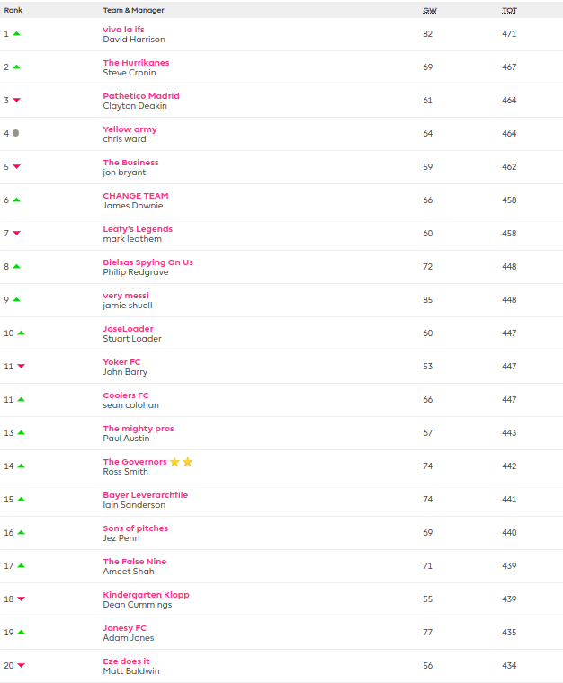 We have a new TOP DOG in the league as DAVID HARRISON climbs from 10th to 1st with a GW total of 82 points. Special mention reserved for the ever dependable STEVE CRONIN stalking him as he moves up to 2nd from 3rd place!