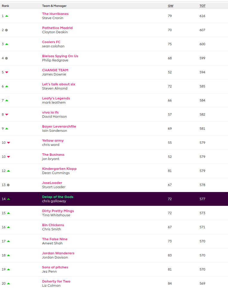 It is with great sadness that we lose both Lawrence Sprigings (35), who may be ruing his decision to hold onto Salah and Wilson who between them added an expensive zero points and Jason Beal (42) who saw his team devastated by the virus with Salah, Zaha & Saiss all falling victim to the invisible enemy. I expect he will be promoting the wearing of masks during his next team talk. Ah well it was fun while it lasted lads.