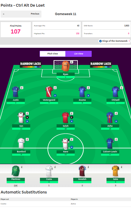 The brightest start of the week went to Tom Henshall (Control Alt De Laet) with his massive hall of 107pts! Most notably here is the benefit of the auto sub which put Zaha (18) into the team instead of Costa (0 – Leeds). The fantasy gods are smiling on you Tom, play the lottery this week eh?