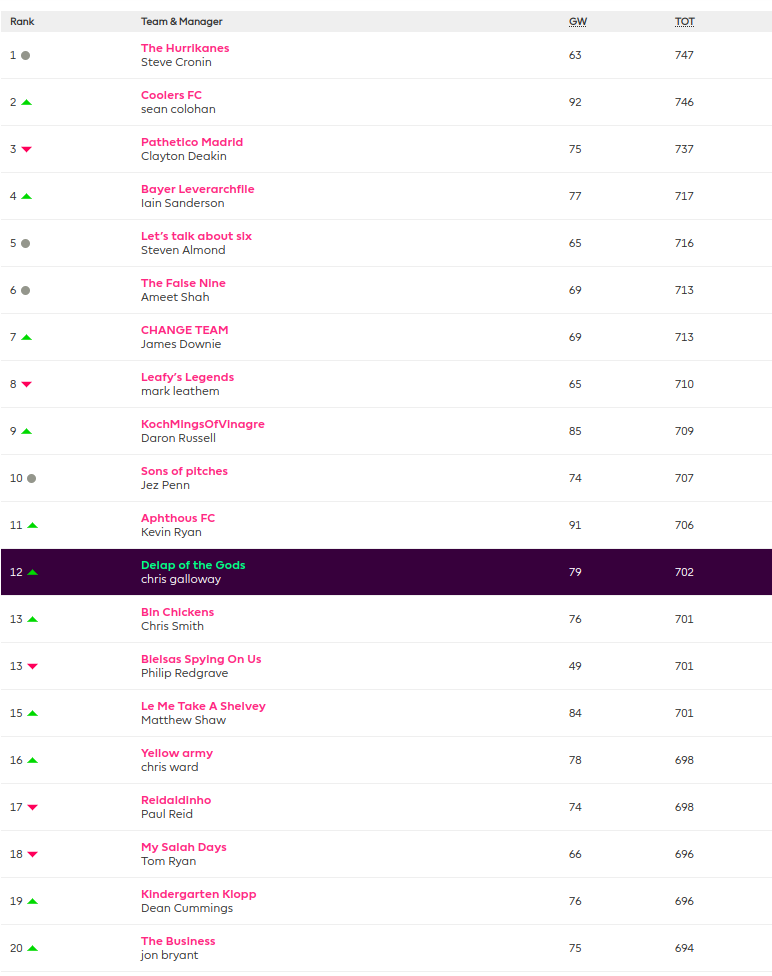 Steve Cronin (The Hurrikanes – 63) is fighting it out at the top of the league and is still top despite recording the lowest game week score in the top 10, all the more impressively as he still hasn’t used any of his chips. Unlike the rest of the top 10 teams who have all used their wildcards at least. The almost aptly named now Pathetico Madrid (Clayton Deakin – 75) went down the brave / crazy path of bench boosting this week and is pushing for that top spot with Sean Colohan’s Coolers FC (92 – with a 4 point hit)