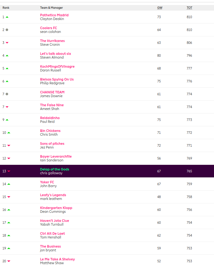 Steven Almond (4th) was another to captain this weeks most successful forward, and big ups to my main man Daz Russell (5th) who can do no wrong this season. Daz was cool as FFUK through all my wind ups, with his one transfer (DCL to Wilson) not mattering. Suffice to say he won our H2H match, and by a comfortable 15 points.