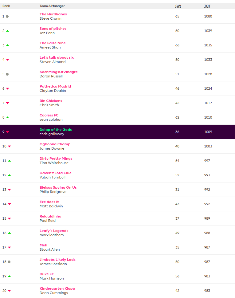 Shout to Roni Friel (37th) who went out of the Conts recently and was just shy of the top 20 places at the end of last season but has now won his place in to the FFUK Champs League with the Joint Top weekly Score of 66. He shares the high GW score with Ameet Shah (3rd) and Joseph Collias (118th) so all 3 qualify for the FFUK Champs League – more news on this one soon from Bakes.