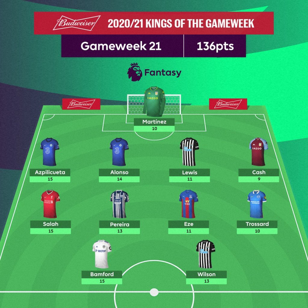 But wait, what’s this? Could Pep have been doing us a favour all along? Is 3pm on a Saturday too early to give up on a gw? Okay, there wasn’t a whole lot to get excited about for the rest of the afternoon with the highly captained Gundogan (3) failing to deliver but at least Pep had the good grace to leave our benched players on the bench. The 5.6m Pereira (13) at West Brom caught the eye along with the 5.8m Eze (13) at Palace. But it was the evening games that got the gw back on track for many. Okay Fernandes (3) failed to return again after the collective disappointment of GW20 but a 0-0 between Arsenal and United meant there were at least some clean sheet points to be had with the defenders taking all the bonus. Similarly at Southampton the Villa defenders hoovered up the bonus points, notably Cash (9) and Martinez (10).