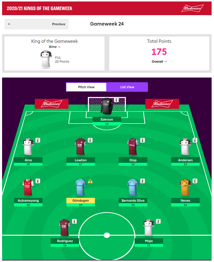 Gameweek 23 was a ‘could do better’ week for me if ever there was one, and just like many other occasions this season, the pain and frustration of another failed gameweek propelled me to look forward to the next, to gameweek 24, to make my transfers and be done with it. Of course, I then spent the build up to GW24 with decisions having been already made, and yes, the DCL injury was a bit of a blow, especially as he had cost me -4 of my -8. Vive la France, as they say in Rome. A straight swap from DCL to Richarlison was relatively painless to bring me down to -12. I’d pressed the button on a bench boost too… “why?” you may ask? Well, earlier this season I thought I’d use my free hit rather than taking some hits, and ever since then I have been making one stupid decision after another, and therefore there was absolutely no reason not to make another. If anything, what I could be doing was out-stupiding myself, basically doing a double stupid, which in reverse psychology is actually good. Leeds didn’t know this, so my bench boost was basically worth about 1 point (Meslier 0, Antonio 0, Dallas -1, Bamford 2).