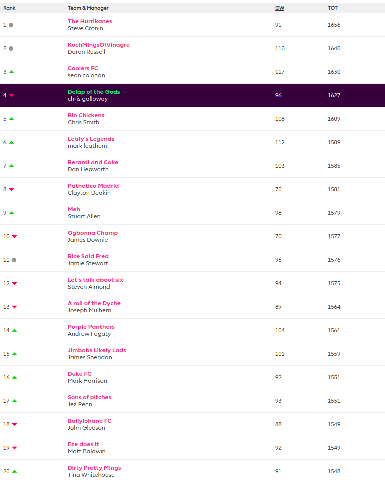 Tis a wonderful thing looking at this Top 20 and seeing so many stellar names in lights. A hardcore FFUK Top 5 sees my little bro Steve (1st) retaining the top spot (I taught him everything he knows), Daz Russell in 2nd (spiritual guide), Sean Coolers up in 3rd (pure zen), and of course, my amigo extradordinario Chris Galloway in 4th. As we can see, Coolers whooped it this week with 117 points from a sublime array of FPL talent through his side featuring Martinez (12), Cresswell (12) as well as Cancelo (8), Gundogan (19) and Foden (11).