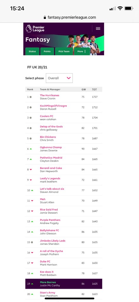 Yabah Turnbull (55) is this week’s unlucky cont with an ordinarily respectable 57 points not being enough this week. I’ve said it before (every week since gw1) and I’ll say it again, you’re better off out of it mate. Onwards and upwards.