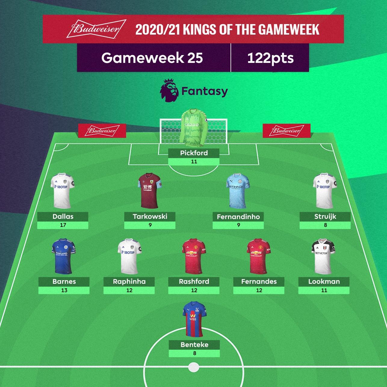 Gameweek 25 was capped off nicely with the second game of the double on Tuesday. The less said about Ings (3) who started on the bench the better, particularly for the 5.49% who captained him and especially JPC (87) who triple captained him. It was though, an epic evening for the 12% of ffukers who owned Bamford (8), Raphinha (12) and Dallas (17).