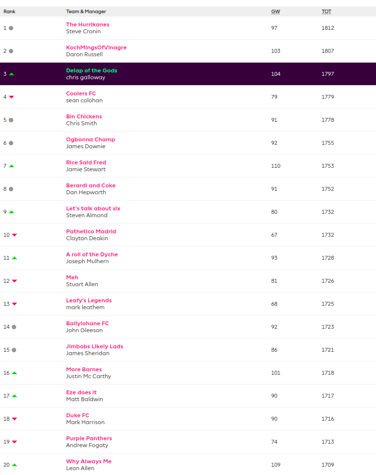 Firstly, there will be big scores (two teams in the top 20 hit their ton this week so nods to Rice Said Fred’s Jamie Stewart – 106pts and Leon Allen’s Why always me -105pts), with Ben Hardiman recording a staggering 133pts thanks to a great triple captain call on Richarlison, netting him 51pts alone!