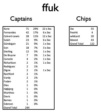 Secondly, there will always be chips… lots of chips! 33 of the top 50 teams in the league played a chip of some kind, with 16 of them opting for the triple captain. As captain choices go there were a few standouts, Kane (8pts) was the leader with 40% of us going for him, closely followed by Fernandes (6pts) backed by 20% and Calvert-Lewin (4pts) 16% of us with Son (14pts) the next most popular at 6%.