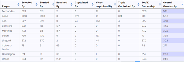 I thought I would have a look through the FPL analytics site this week as their can be some interesting stats around ownership and ICT / Value ratios. I have pulled a couple of tables found below from the site which highlight the current top ownership stats for the top 50k players in the game as well as the top 1K. 972! Of the top 1K captained Kane this week!