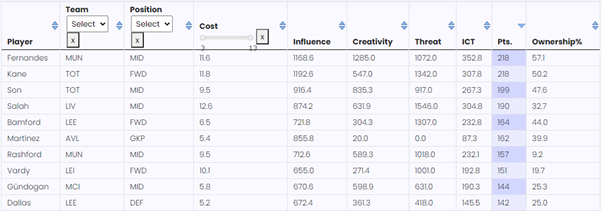 Looking at the ICT / point vs ownership table below highlights one particular player somewhat inexplicable low in term of ownership. Rashford! With only 9.2% the only one in single digits of the top 10 points haulers, #DIFFERENTIAL.
