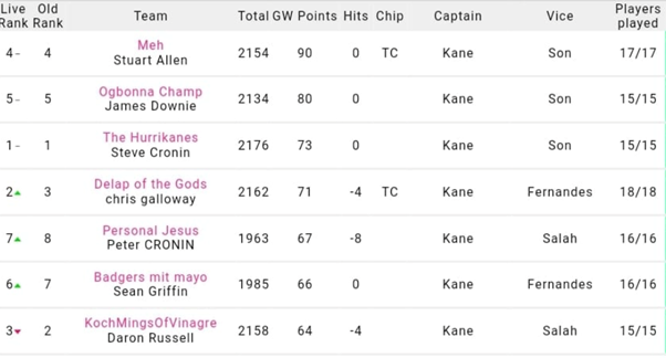 A fantastic performance this week from @KevinRyan with a top score of 91 points having fired his Triple Captain on Kane and putting in a stellar defensive performance with Sanchez, Rudiger and TAA all doing the business.