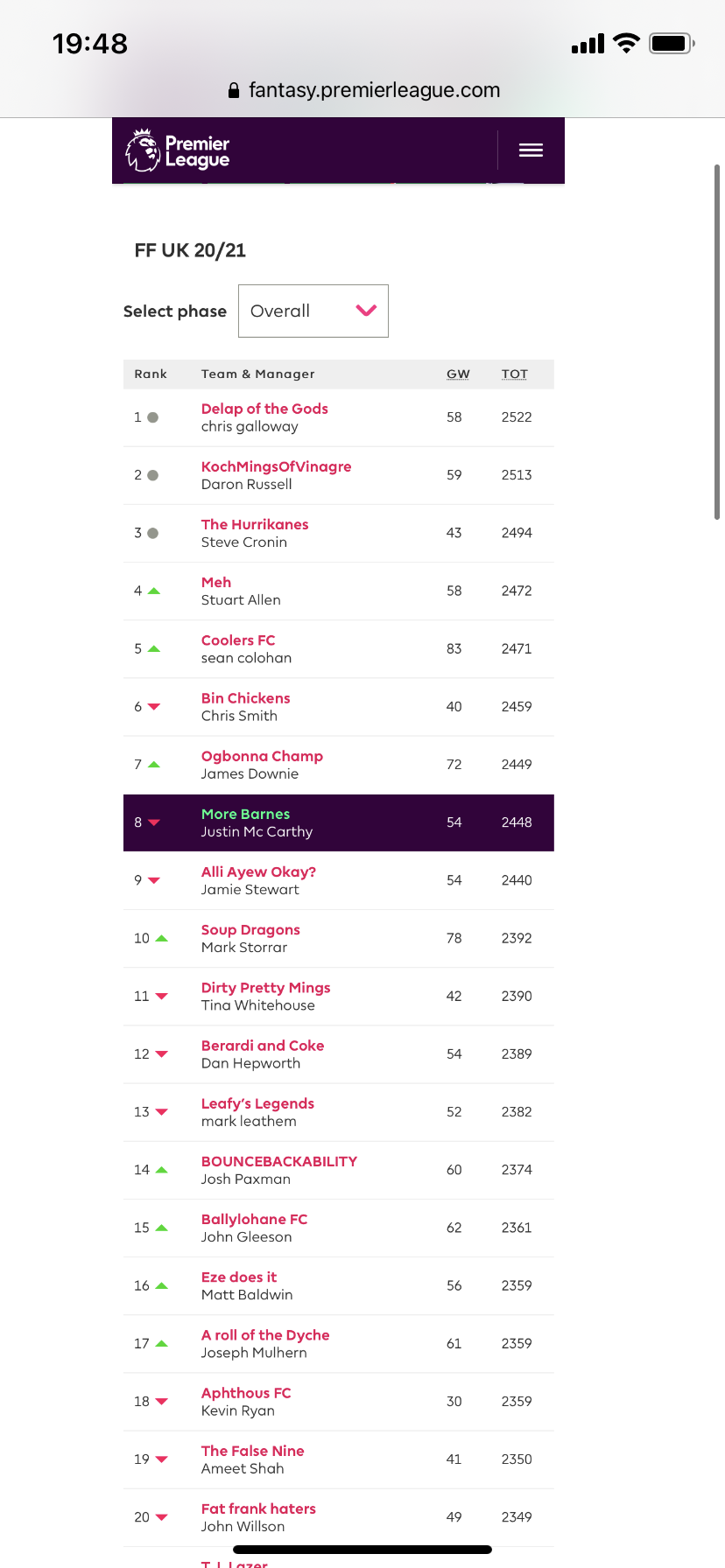 So on to the Famous Big 3 who have been leading the way most of the season. In pole position is Chris (1) whose score was matched by Darron Russell (2) this week. Lots of important decisions and a couple of sleepless nights ahead for those two. Steve Cronin (3) has been playing down his chances and looking to the cup for consolation but we’ve all seen gaps like that made up on the final day before. A daring captain and a bit of luck can go a long way. Apologies for not including Stu Allen (4) in the big three but that extra gap looks a bit too much to make up right now. Stranger things have happened though. A GW37 high score of 83 for Sean Colohan has moved him firmly into fifth with eyes for fourth and maybe above. Behind that there’s plenty of jostling between sixth and ninth, including me. Some of us are heading to Europe proper, some of us will have to make do with the Europa Conference League.