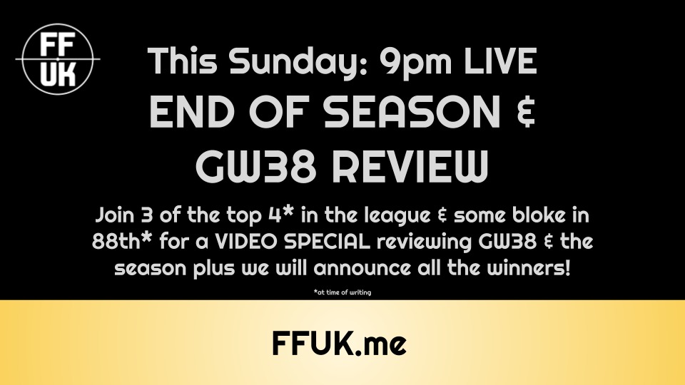 That was a surprisingly business like review for all my talk of getting loaded and having a good time. Now that we’re all clear on what’s up for grabs Sunday promises to be an epic finale so make your transfers, set your team and kick back and enjoy the last GW of the season. Thanks for reading and good luck with your final decisions.