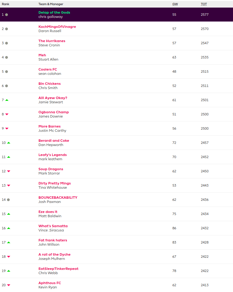 Andy Heath (167th) wins this by scoring 89 points in the final GW. He took 2 hits but that didnt matter for this prize of £50