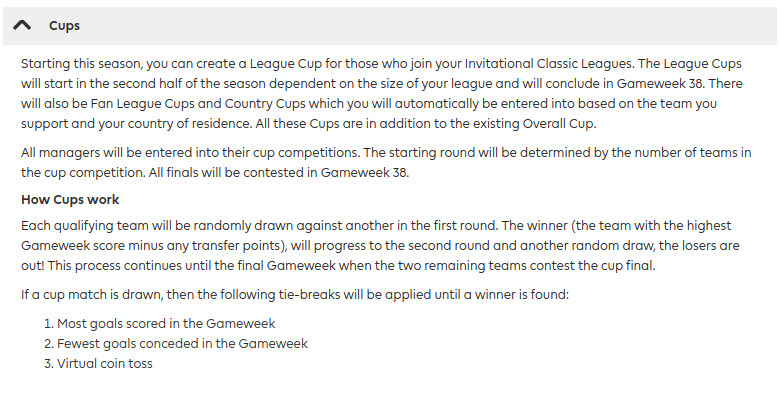 This season we have a brand new cup competition (this is in addition to our FFUK Cup and Milk Plate which our man Bakes will run), which will be using the new official FPL Classic Cup. Exciting. In terms of format there will be a qualification week followed by weekly ties which climax with the winner crowned in GW38. See below for more from the official rules: