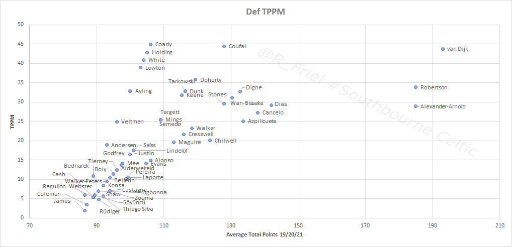 To obtain TPPM for each player I apply the following, (note this years stats are an average of the previous 3 years FPL returns, there are some modifications for outliers such as the VVD injury from last season)
