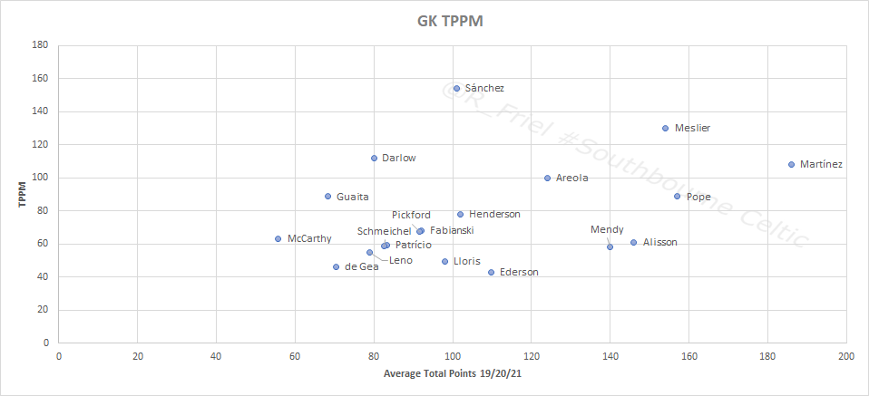 As can be seen, Sanchez at Brighton provides the highest ROI for each 0.5m spent based upon this seasons pricing and the previous 3 seasons Average Total Points with a whopping TPPM score of 154. I will leave the consideration of whether Martinez, Allison or indeed Emerson is worth the extra investment up to you.