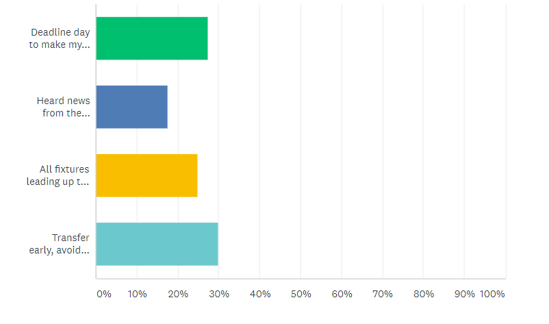 The results on this were fairly spread. 30% go early and beat the price change, 25% wait until all fixtures have been played before the deadline, while 28% keep their powder dry until deadline day.