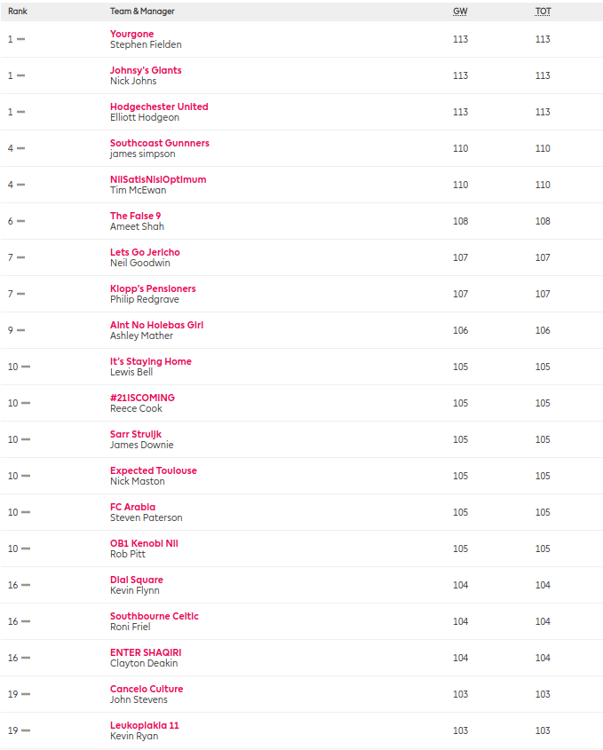 Onto the FFUK league table, in the olden days league tables werent published until 6 games had been played but nowadays its all the rage to show them early doors, so please find below the FFUK top 20 after GW1, this is where you want to be at the end of GW38. The road is long…