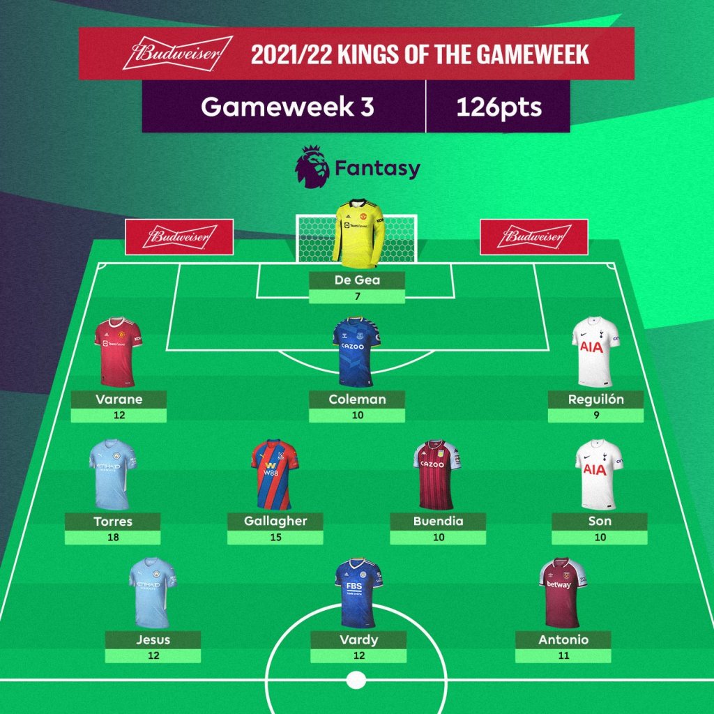 GW3 top 3 haulers were Torres with 18, Connor Gallagher with 15, getting Palace off the mark with two goals in a 2-2 draw, and Jesus, Varane and Vardy coming home with a very respective 12 points each.