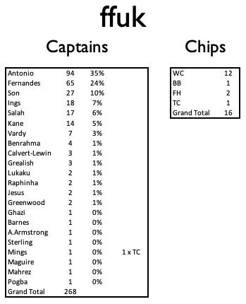 On to the real stuff. From the offset, GW3 felt like it was back to true FPL business and the picks suddenly felt more difficult. The introduction of Lukaku, the return of Kane, plus the form of DCL and Antonio, meant the template teams many succeeded with in GW1, was now starting to alter. A perfect example was the spread of captains picked for GW3 in FFUK, after 71% picked Salah in GW2, 35% went for the Ant man, 24% on Bruno, while 10% opted for Son as their captain. Mr Chip made 16 appearances this week, one punter, Steve Barnard (237th) triple captaining Mings, who ended up being out injured! (unfortunately for Steve his VC was Pogba which meant just 6 points acrrued with that TC chip), Check out Statto Steve Cronin’s captaincy and chip stats below for GW3: