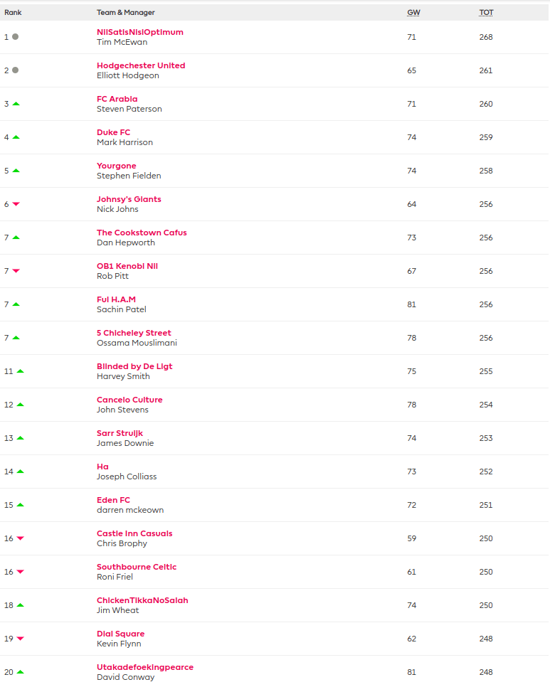 But this game can’t always be about glory as we bid farewell to two more from our Conts league, this week we wave adios to Mikel Arteta… wishful thinking eh?, but seriously all the best for the rest of the season but you weren’t very good this week, Paul Reid (33 points) and Rob Marriott (34 points) the admin will remove you before the next deadline. 👋🏽