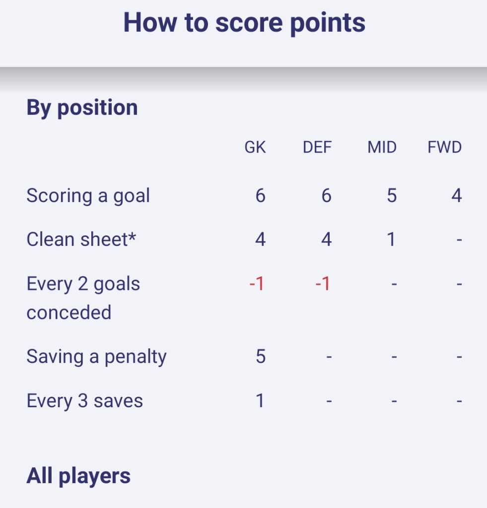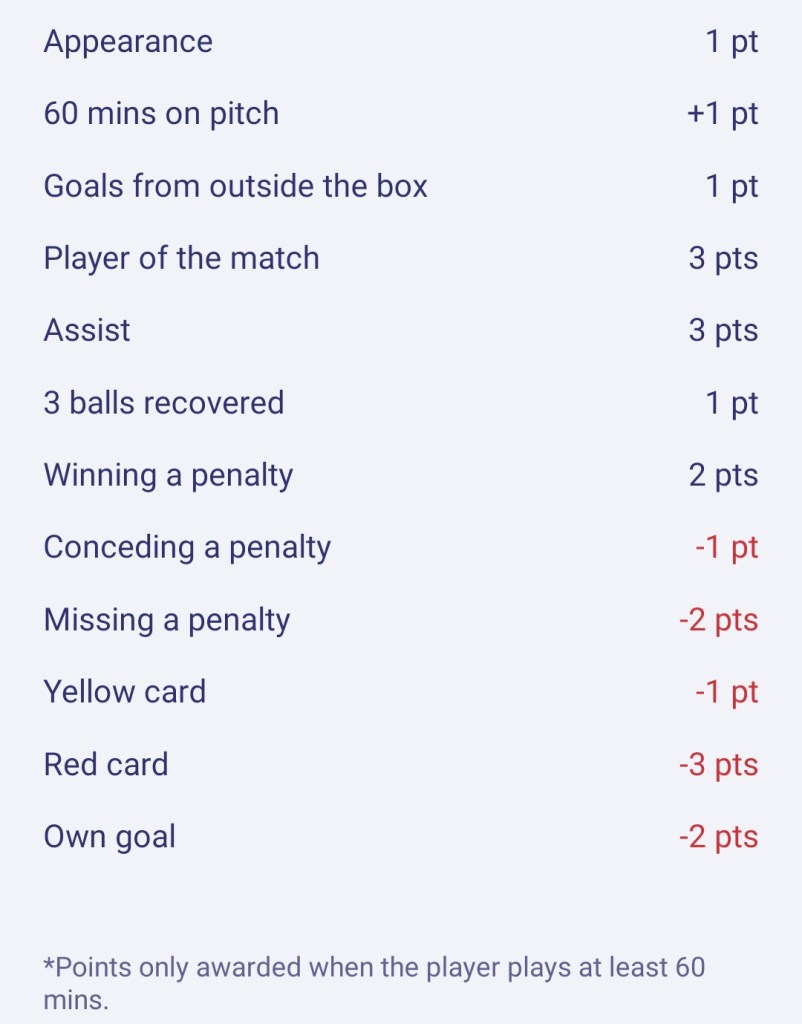 The scoring is a little more nuanced than FPL. For a full breakdown of how points can be scored see below: While there isn’t a bonus point system it does reward the Player of the Match and with points for things like “Balls recovered” making defensive midfielders a more enticing prospect. You’ll also find certain players, usually defenders, are a magnet for them.