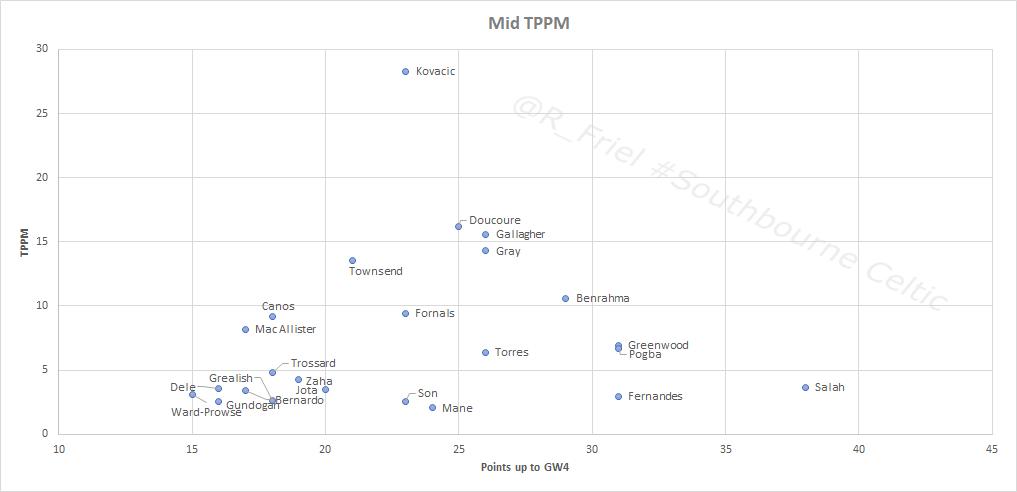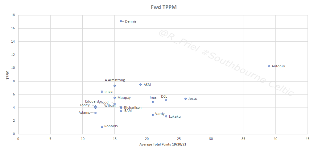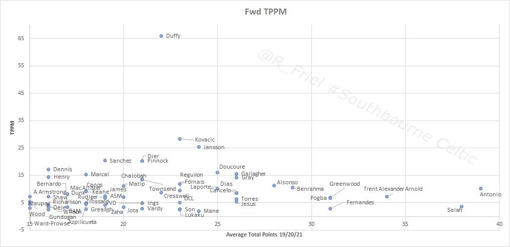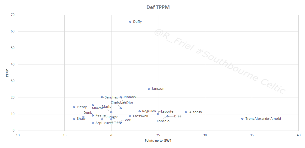 As it stands Duffy is far and away the most cost efficient way of scoring points generating 66 points per million spent by the TPPM formula. Whilst Trent continues to outscore the field his TPPM remains relatively low due to the cost to get him in. How is Shaw looking …. still in my team!