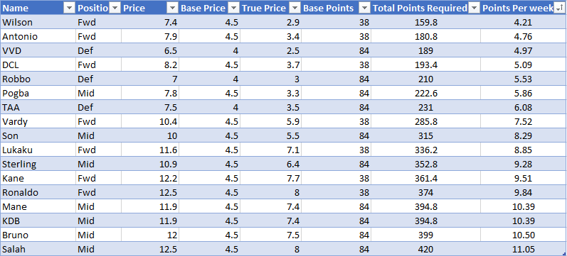 So i turned TPPM on its head in a bid to work out what a “good” weekly score needs to be for each of the premiums to generate optimum use of budget. To do this i took a base line from the previous 3 seasons of 42 points per million using the TPPM formula.