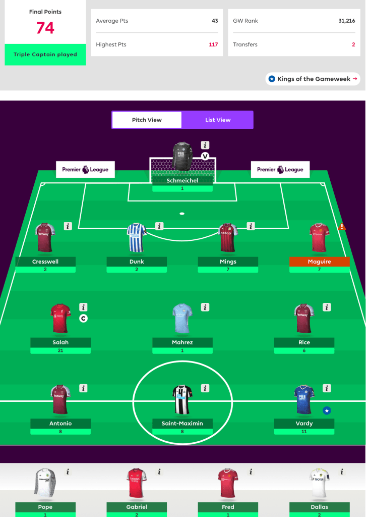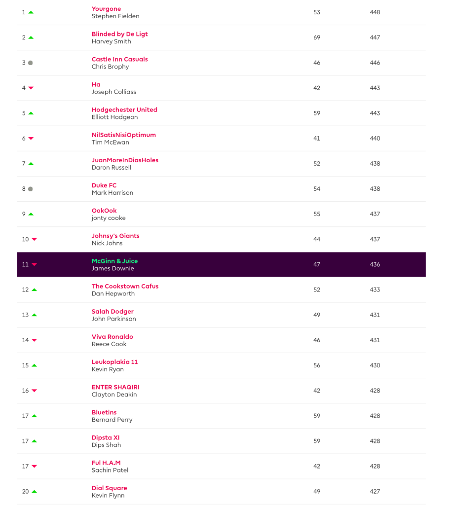 Top scorer this week was Ira Wilson (Redpool) with 74 points. They had Salah Triple Captain and Vardy, Antman and ASM upfront. Team below.