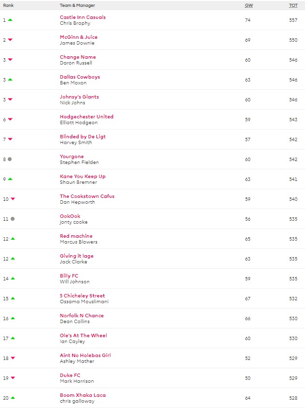 On to the FFUK league now… and we’ve got a new leader! James Downie (last week’s table topper) scored a more-than-respectable 69 points, but he took an 8-point hit, and Chris Brophy came in with a very impressive 74 points and now tops the table. ‘Dangerous’ Daron Russell is still flying high in third despite being pulled up by the jobsworths at FPL Towers for an inappropriate team name.